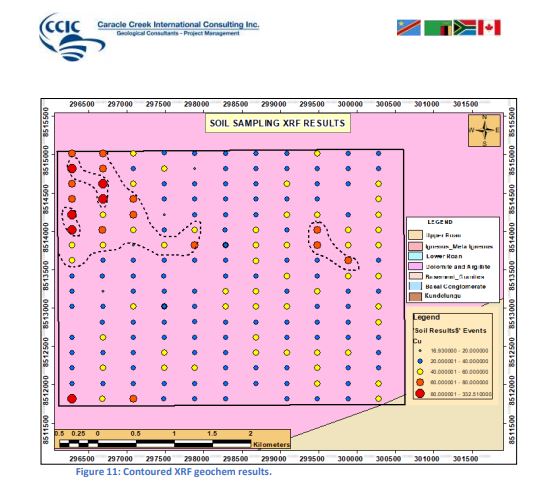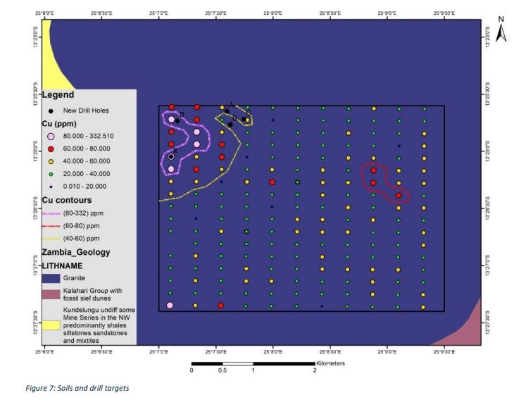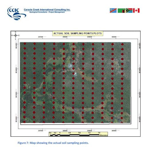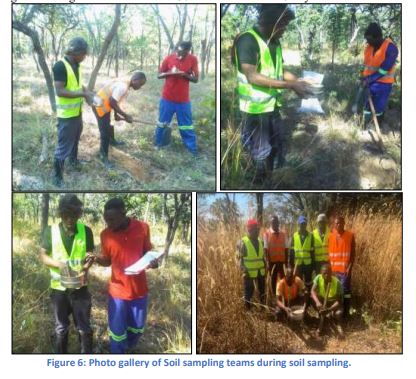 Soil sampling program commenced on 30th May, 2023 and ended on 3rd June, 2023. Daily traverses were done from mufumbwe to the grid covering a distance of about 130km to and from for 5 day. The datum system used is Arc 1950 and all measurements were in SI units, two hand held GPS were used during soil sampling works by two sampling crews. Samples wee sieved to -180 mesh size were the sampling interval was 200m x 400m line spacing and sample spacing designed or oriented in the North-South direction. A total of 11 sampling lines were designed, each line had 17 samples that was sampled sieved and bagged. A total of 187 samples was to be located within license 29051-HQ-LEL and only two samples wee not collected because the sampling points were failing in water that tells that only 185 samples were collected. A total of 37.4km was traversed by the sampling crews during soil sampling, each line was 3.4km long running from south to the North the QAQC ( duplicates, standards and blanks) account for about 5% of the Data collected. Total number of samples collected was 185 , 4 standard samples, 2 blank samples and 5 duplicate samples which reaches to Total sample submitted for analysis to be 197 samples.