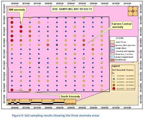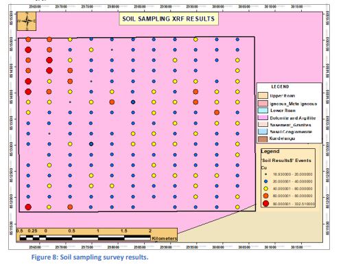 Quick Copper Mine Limited carried out a soil sampling programme to identify copper anomalies and generate potential drill targets within the licence area. A total of 187 sampling points were planned, with 185 samples successfully collected; the remaining two points could not be sampled due to water cover. The survey covered approximately 37.4 km, using a grid pattern of 200 m spacing along north-south oriented lines across 11 traverses, each comprising 17 sampling points. All collected samples were dried, sieved, and analysed for copper content. The results revealed three main copper anomalies located in the north-western, eastern-central, and southern parts of the licence. Among these, the north-western anomaly, covering approximately 1.3 km by 1.0 km, emerged as the most significant, with copper values reaching up to 300 ppm, suggesting strong potential for mineralisation in that part of the licence area.