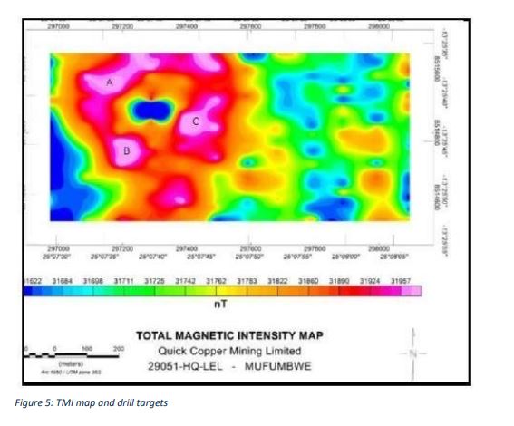 A magnetic survey was undertaken to refine drilling targets within the licence area, with a focus on the major copper anomaly identified in the north-western portion. The survey was conducted on 100 metre line spacing and comprised 26 magnetic lines across the target zone. This work corresponded with the previously defined north-western soil anomaly, which had shown the strongest copper response. Based on the magnetic results, three drill targets designated A, B, and C were planned within this anomaly to assess its mineral potential. While the localised survey delivered valuable structural and lithological insights, a comprehensive magnetic survey over the entire licence area is still required to delineate additional targets and geological structures.