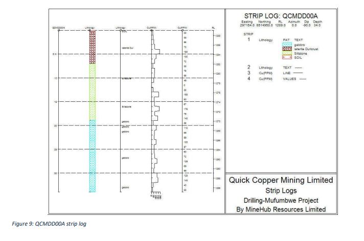 Quick Copper Mining Limited undertook a preliminary test drilling programme using a cost-effective geotechnical rig to validate Geochemical anomalies identified through prior soil sampling. Three boreholes were drilled to depths of approximately 30 metres. 1. QCMDD00A (north of the licence boundary): Drilled to 34 metres, recording copper concentrations of 150 - 200 ppm within siltstone. 2. QCMDD00D (north-western boundary): Returned the highest values of 500 - 600 ppm but was prematurely terminated, indicating potential for further mineralisation at depth. 3. QCMDD00D (north-eastern boundary): Recorded copper values up to 350 ppm within the first 7 metres. The drilling results correlate strongly with soil anomalies and confirm the presence of copper mineralisation within the license area. These findings justify more advanced drilling to better define the subsurface potential.